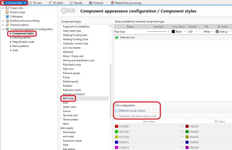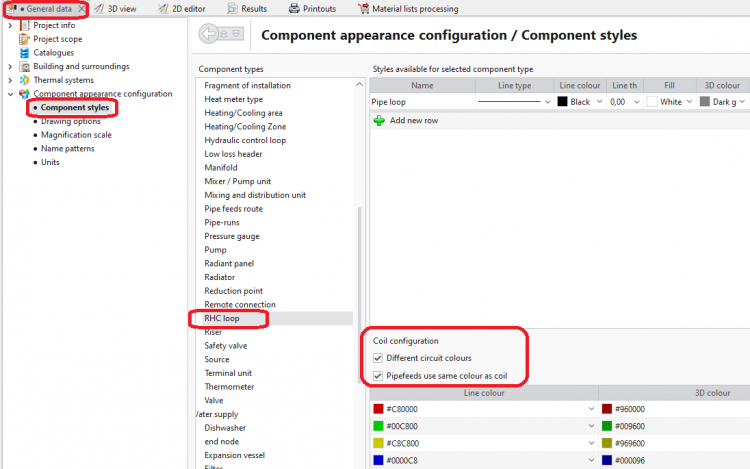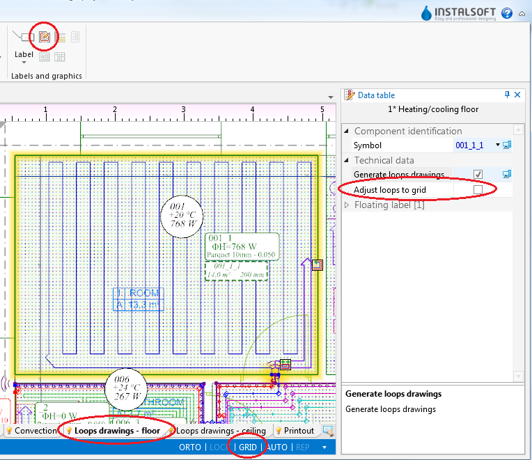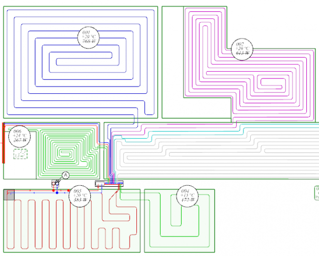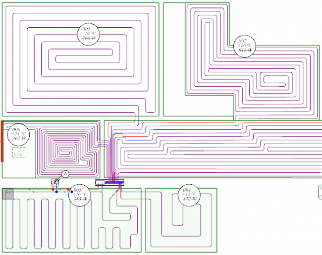 The Heizkreis component (floors and ceilings) can be appended with drawings of loops. Drawings generated automatically by the program are refreshed each time the project is recalculated. It is possible to modify or append them and loops can be drawn manually. Manual editing is recommended at the final stage of design.