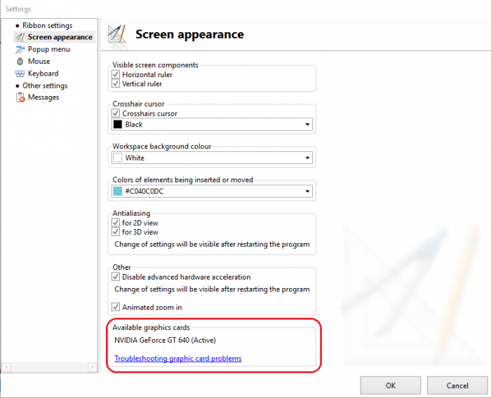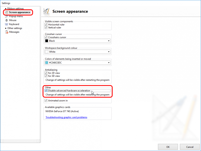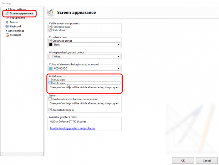 - Kontrollkästchen Antialiasing für 2D-Ansicht, bzw. Antialiasing für 3D-Ansicht abwählen und Änderungen durch klicken von OK bestätigen.