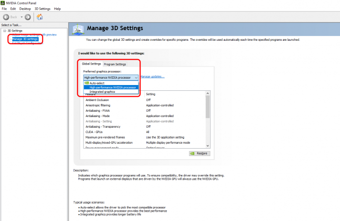 Automatische Auswahl der verwendeten Grafikkarte deaktivieren. Dies kann Auswirkungen auf die Windows-Energieoptionen (Energiesparpläne) haben. Die Akkulaufzeit des Laptops wird sich verringern!